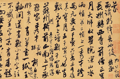 書については全くの門外漢の私ですが,東京国立博物館で,初めて「楽志論屏風」を見たときは,深々とした豊かさと力強さがとても心地よく、市川米庵という書家の存在を知りました。それから数年後,訪れた台北の故宮博物院で,今度は「蜀素帖」に出会いました。抑制されてはいますが流麗な線に驚きながら,キャプションを見ると,作者は米芾(フツ)という人だと分かりました。どちらも「米」を用いていることが気にかかり,後日調べてみると,江戸末と北宋,およそ8百年の時間と2千数百キロの空間を超え,米庵が米芾を敬慕していた事実を知り,然もありなんとやや得意な気分で納得したしだいです。