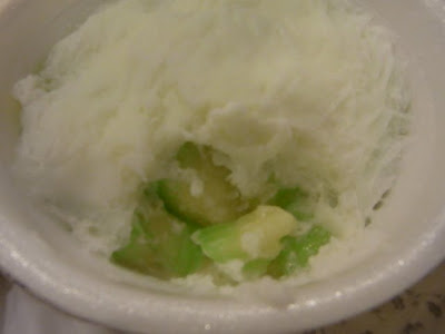 なんかデザートを食べたいねということになり、そこからアパートへの道の途中でかき氷の店を発見。小雨降って寒かったので本当は温かいものをと思ったけど他に見当たらない。そこで食べるのは寒いので、持ち帰ってあたたかい部屋で食べようということに。